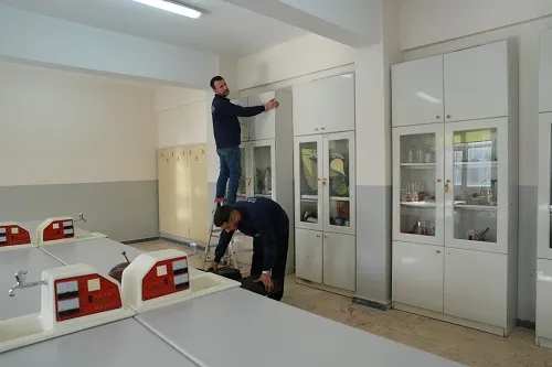 Okullarda devam eden çalışmalar kapsamında, sınıf ve ortak kullanım alanlarında bulunan dolap, raf, kitaplık, laboratuvar ekipmanları ve benzeri mobilyaların sabitlenmesi işlemleri; yapı güvenliği ve deprem mühendisliği kriterleri doğrultusunda gerçekleştiriliyor.
