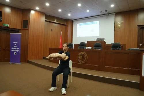 ‘Temel İlk Yardım ve Farkındalık Semineri’nde Kartal Belediyesi İlk Yardım Merkezi Eğitmeni SevilAtmaca pek çok konuda temel bilgileri uygulamalı olarak verdi. Yaklaşık 2 saat süren eğitimde temel ilkyardım bilgilerinin yanı sıra, olası bir kaza, yaralanma, boğulma, yanık vb. gibi durumlarda yapılması gerekenler sırasıyla anlatıldı.
