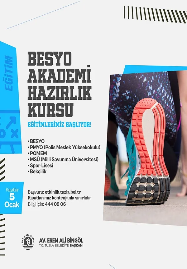 Tuzla Belediyesi, öğrencilerin fiziki yeterliliklerini geliştirmek ve parkur sınavlarına hazırlanmalarına destek olmak amacıyla hayata geçirdiği BESYO Akademi Hazırlık Kursları’nın başlangıç tarihini duyurdu. Kayıtlar, 5 Ocak Pazartesi günü saat 11.00’den itibaren Tuzla Belediyesi’nin resmi internet sitesi üzerinden yapılabilecek.