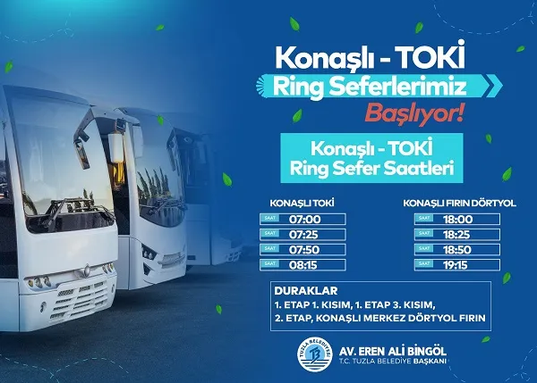 Ring hattının hareket noktaları Konaşlı TOKİ ve Konaşlı Fırın Dörtyol olarak belirlendi. Konaşlı TOKİ’den sabah saatlerinde 07.00, 07.25, 07.50 ve 08.15’te kalkış yapılacak. Akşam saatlerinde ise Konaşlı Fırın Dörtyol’dan 18.00, 18.25, 18.50 ve 19.15’te seferler gerçekleştirilecek.
