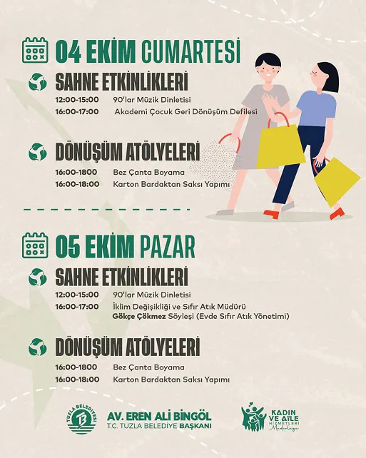 Tuzlalı kadınların kuracağı stantlarla hayata geçecek etkinlik, 4-5 Ekim 2025 tarihlerinde Tuzla Sahil Tören Alanı’nda ziyaretçilere kapılarını açacak. Etkinlikte, geri dönüşüm temasıyla ikinci el ürünlerin yeniden ekonomiye kazandırılması hedeflenirken, hazırlanan sahne etkinlikleri ve atölyelerle katılımcılara eğlenceli ve öğretici bir deneyim sunulacak.