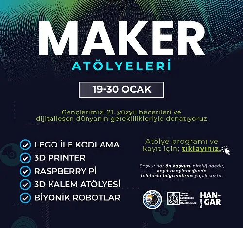 Kartal Belediyesi’nin çocuk ve gençlere bilim, mühendislik ve teknoloji alanlarında yenilikçi deneyimler kazandırmak amacıyla düzenlediği Maker Atölyeleri, 19–30 Ocak 2026 tarihleri arasında sömestir dönemine özel olarak Makina Hangar’da gerçekleştirilecek.İlkokul, ortaokul ve lise öğrencilerine yönelik olarak planlanan eğitim programı sayesindeöğrenciler, teknoloji ve üretim temelli uygulamalarla buluşma şansı elde edecek.