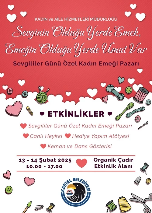 Kartal Belediyesi Kadın ve Aile Hizmetleri tarafından ‘Sevginin Olduğu Yerde Emek, Emeğin Olduğu Yerde Umut Var’ temasıyla 13 Şubat Perşembe ve 14 Şubat Cuma günü saat 10.00-17.00 saatleri arasında Organik Çadır Etkinlik Alanı’nda bir dizi etkinlik yapılacak. Kartallı 120 katılımcı kadının yer alacağı Sevgililer Günü Özel Kadın Emeği Pazarı kurulacak. Keman dinletisi ve dans gösterisinin yanı sıra hediye yapım atölyesi, canlı heykel ve ikramlarla devam edecek etkinlikler 2 gün boyunca sürecek.